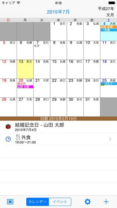 このアプリでは、日本人向けカレンダーらしく大安・友引・先勝など、六曜がしっかり表示されるようになっています。大切な入籍日や結婚式を決める際にはとても役に立ちます。