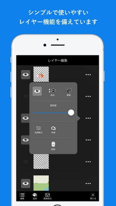 また、表示非表示、レイヤー順の変更や透過レイヤーも可能です。