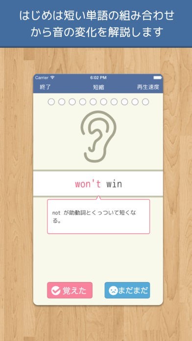 このアプリは、上記のようなルールをたった6つにまとめ、ドリル形式で集中的に学べる画期的なアプリです。6つのルールをマスターすれば、リスニングはできるようになります!