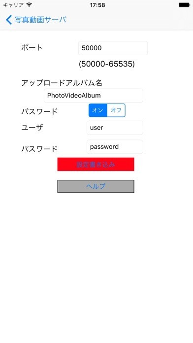 設定で"ポート""パスワードのあるなし""ユーザ名""パスワード""アップロードするアルバム名"などはを設定することができます。