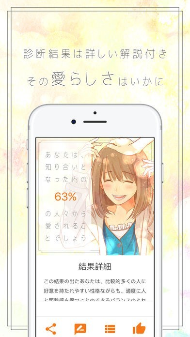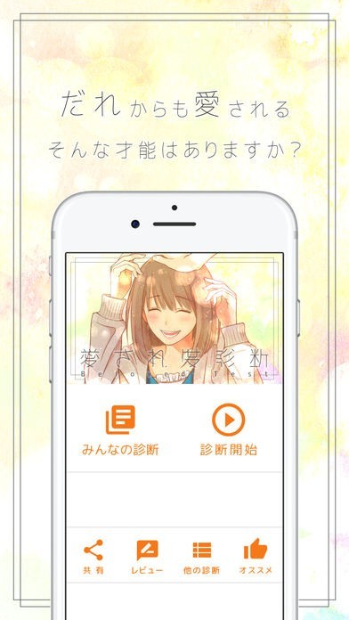 このアプリでは、自分がどれだけ皆に愛されているのかを、ランダムに出題される15の質問や心理テストにより診断することができます。