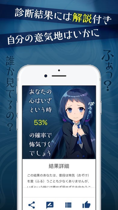このアプリでは、自分が普段どれほど意気地なしかを、ランダムに出題される15の質問や心理テストにより診断することができます。