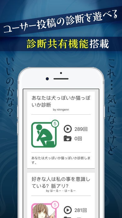 「みんなの診断」は、Testii が運営するウェブサービスにご投稿いただいた診断ゲームの一部を、本アプリ内で遊ぶことができる機能です。人気作品をランキング形式で表示、その中から好きなものを選び遊ぶことが出来ます。なお、診断の作成及び投稿は、アプリ内からはご利用できませんので、ご了承ください。