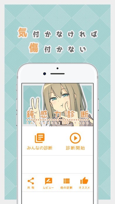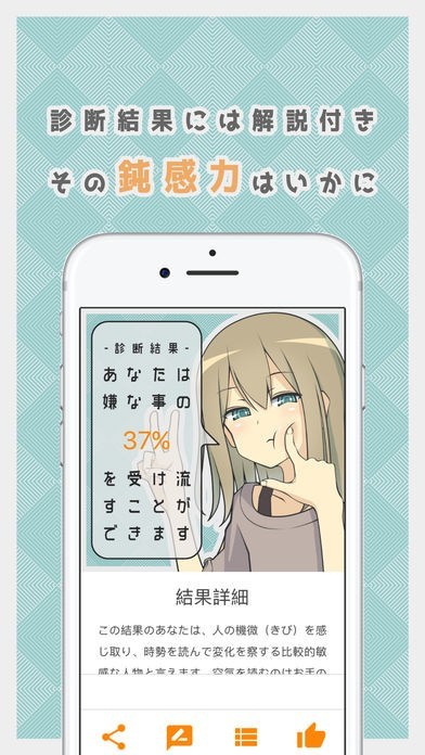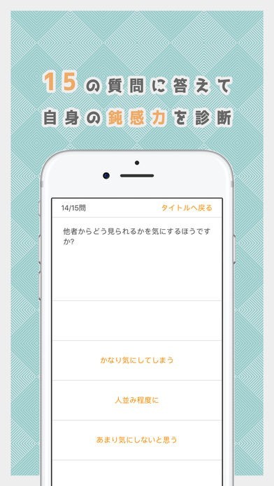 このアプリでは、自分がどれだけ鈍感に生きているのかを、ランダムに出題される15の質問や心理テストにより診断することができます。