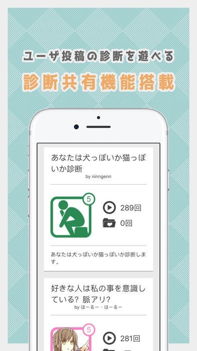「みんなの診断」は、Testii が運営するウェブサービスにご投稿いただいた診断ゲームの一部を、本アプリ内で遊ぶことができる機能です。人気作品をランキング形式で表示、その中から好きなものを選び遊ぶことが出来ます。なお、診断の作成及び投稿は、アプリ内からはご利用できませんので、ご了承ください。