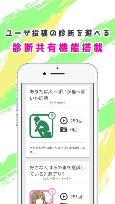 「みんなの診断」は、Testii が運営するウェブサービスにご投稿いただいた診断ゲームの一部を、本アプリ内で遊ぶことができる機能です。人気作品をランキング形式で表示、その中から好きなものを選び遊ぶことが出来ます。なお、診断の作成及び投稿は、アプリ内からはご利用できませんので、ご了承ください。