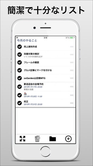 資料作成や書類の仕上げなど、するべきことに集中できずに困ったことはありませんか? 「DekaTodo」では、今やるべきことへの集中を手助けしてくれます。 登録したタスクを画面全体に大きく表示してくれるのがこのアプリのユニークな特徴。 画面いっぱいに表示されたタスクによって、集中力を逸らさずに仕事をやり切ることができるでしょう。 リマインダー機能では指定時間に通知も可能。 さらに細かいタスクの管理や持ち物の確認に使いやすいチェックリスト機能も用意されており、タップするだけでチェックをつけていくことができます。