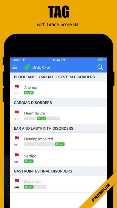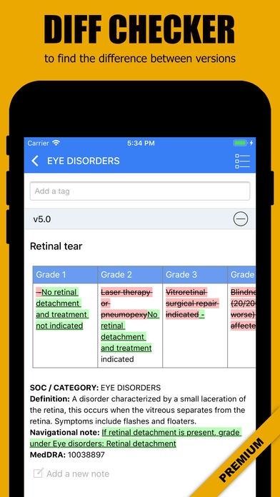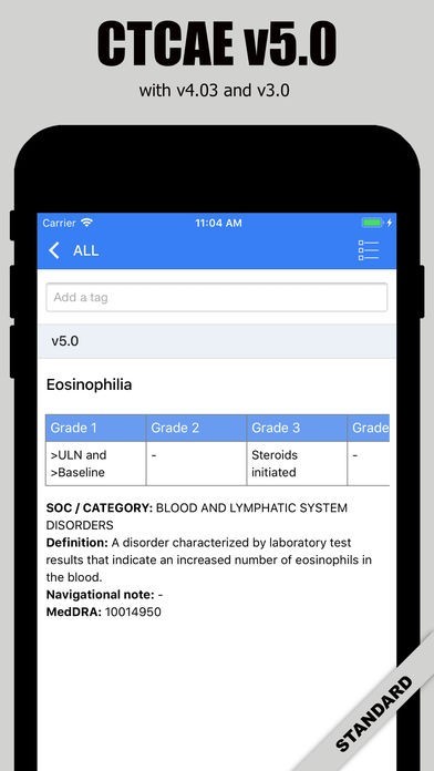 Add multiple tags to a single AE term in each CTCAE version. Remove a tag by pressing and holding as well as by tapping x button. The tagged events are printable and exportable. See 'Review' and 'Print and Export'.
