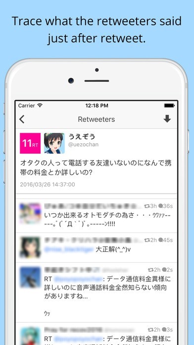 「RetweeTrace」ではTwitterユーザーの本音を知りたい時に便利です。 Twitterでツイートした後、他のユーザーがリツイートしてくれることがありました。 リツイートが増えていくと自分のツイートが広がっていくのが魅力です。 しかしリツイート直後にどんな内容がツイートされているのか気になることがあります。 リツイートしてくれたが、直後では悪い評判のツイートが付いているかもしれません。 そんなツイート内容を知りたい時に使えるのが一番の特徴となっています。 リツイート直後もリツイートの時はスワイプ操作で次に進めます。