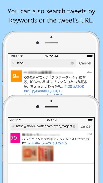 自分の投稿がリツイートされたら、その感想が気になりませんか?Twitterのリツイート専用閲覧ツール「RetweeTrace」では、リツイートされた投稿を一覧表示する機能などを搭載。どんな投稿が注目されたのかを一覧で確認しつつ、投稿をタップで指定するだけでリツイート直後の呟きや感想をチェックできるようになっています。使いやすい検索機能も用意されており、フリーワードでの検索が可能。さらにURLを指定しての詳細な検索も行える一方で、すべての検索でリツイートの絞り込みが行えるのもこのツールならではの特徴でしょう。また、リツイート数をアイコン形式で判りやすく表示する機能などもあり、話題の投稿も見つけやすくなっています。