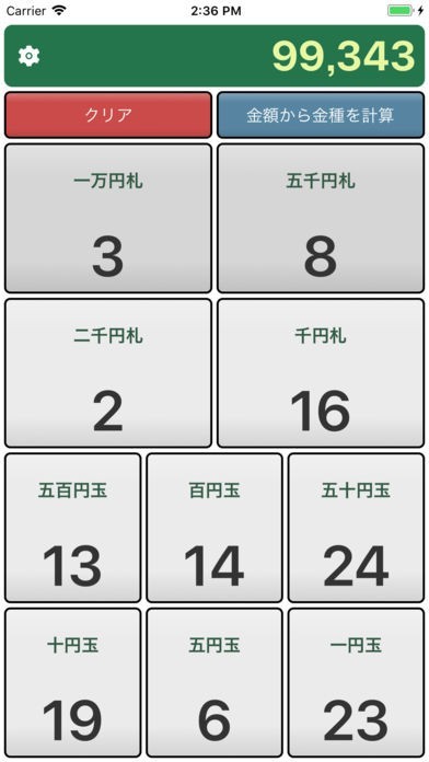 いろんな種類のお金がたくさんあるときに便利に使えます。紙幣・硬貨を種類ごとに素早く計算します。逆に、最初に金額を決めて、それに必要な金種を把握するのにも使えます。