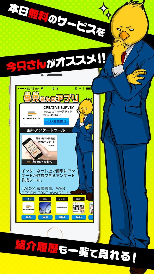 無料セール情報を上から目線で俯瞰する!? 見た目はヒヨコで、頭脳は大人『今只(イマタダ)さんのアプリ!!』のスクリーンショット