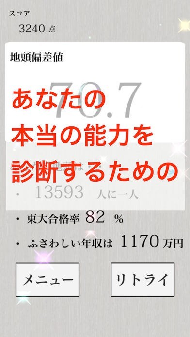 「地頭力診断」は脳トレの一種でパズルゲームのアプリです。地頭力とは「自らの力のみで課題をやり抜く能力」の事で、知識のみの学力ではなく、判断力が問われる問題解決能力の事です。このアプリでは現在のあなたの「地頭力」を19種類のテストで測ります。地頭力を基にあなたが評価されるべき年収や東大を受験した場合の合格率なども表示されるので参考にしてください。診断を何度か繰り返すうちにあなたの地頭力は鍛えられ、SPIの練習にも最適です。