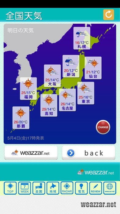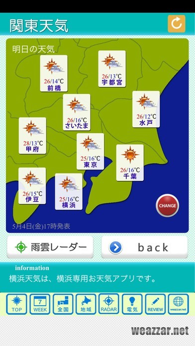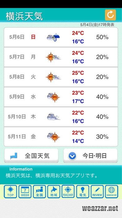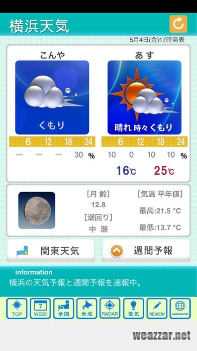横浜天気は横浜の最新のお天気情報を素早くチェックすることができるアプリです。気象庁が発表する情報に基づいて、今日と明日の天気、週間天気予報が表示されます。雨雲レーダーや潮などの情報もあります。横浜の天気はもちろん、関東全域の天気、全国の天気まで知ることができます。シンプルな機能でが操作が簡単なのが特徴的です。