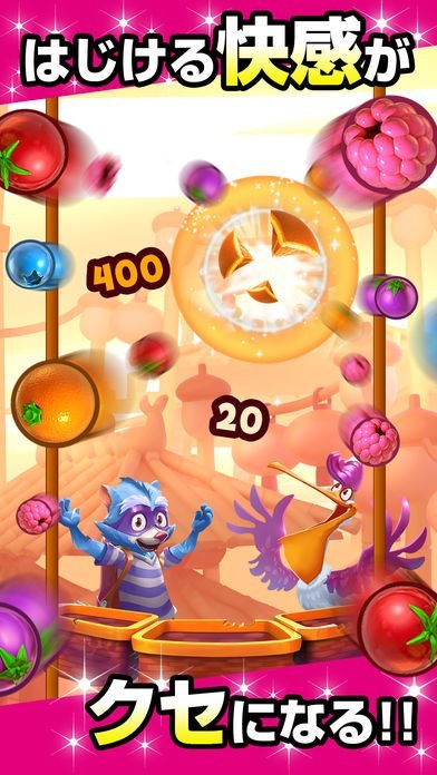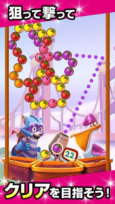 野菜やフルーツを模したカラフルなバブルを打ち出し、重力や反射を考えながら浮かんでいる他のバブルを消していくゲームです。シンプルながらも奥深く、いつのまにか熱中してしまいます。