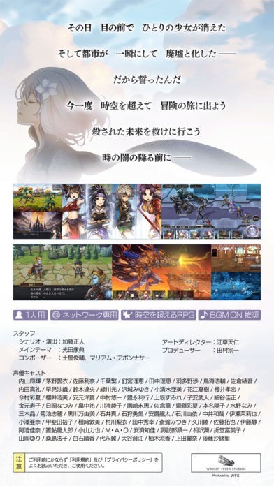 なんと...このアプリの開発には、「ぷよぷよ」などを担当した高大輔氏を筆頭に「クロノシリーズ」や「ゼノギアス」を手掛けた加藤正人氏がシナリオを担当しているんです! さらにさらに...サウンドには光田康典氏、グラフィックには江草天仁氏という超豪華メンバーが携わって作られています! メンバーが豪華なだけに、ストーリー性からメインテーマの楽曲まですべてが一級クラスです!