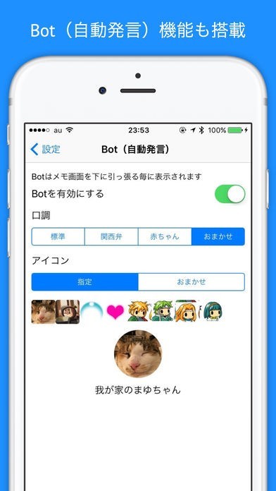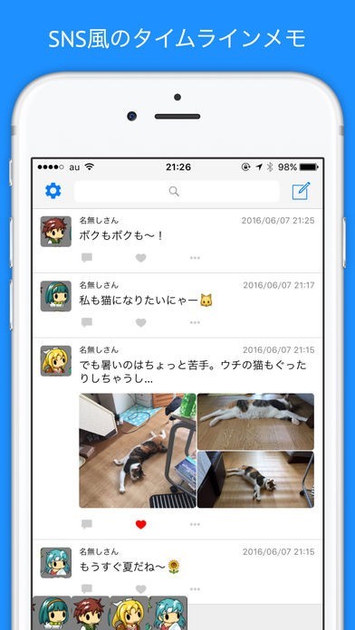 まるでSNSに投稿しているような感覚になる、一風変わったメモアプリです。見た目はSNSそのものです。メモした内容もまるでチャットしているかのように表示されます。アイコンを使い分ければ、一人で何役も演じる事ができます。こうすることで、自分の頭の中だけではまとまりきらなかった内容が、第三者目線から見ることができるので、違う角度から物事を考えられるようになり、よりよりアイディアが生まれやすくなります。某SNSサイトのようにbotやいいねボタンがついており、暇な時間も楽しく使用することができます。また、リアルなチャット形式なので、会話下手な人は、このアプリで会話のシミュレーションができてしまいます。