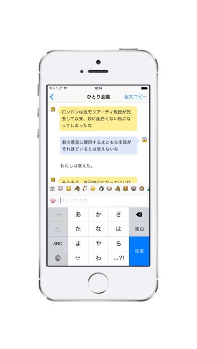 このアプリは自分の考えをチャット形式でメモするアプリです。このアプリを使いますと、普段は一方的な視点でしか捉えられなかった事が対話形式のチャットで表示することで別の視点からその事を見ることが出来るようになります。また、自分自身の意見や考えを多方面の視点から可視化出来るので頭がすっきりと整理する事ができます。また、チャット形式でメモをする際のアイコンも自由にカスタムしたり、絵文字と吹き出しカラーを使い分けることも出来ます。 自分の意見を整理するだけでなく、大切な人とのチャットする前の予行練習用にも役立ちます。 さらにコンピュータがあなたとの話し相手となって会話してくれる機能も搭載しております。