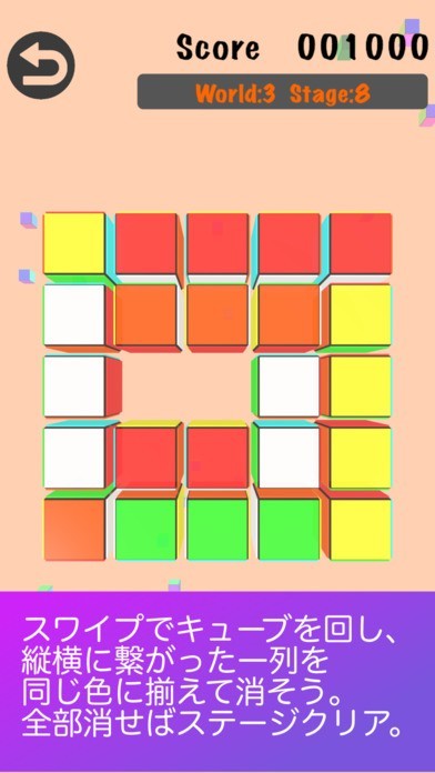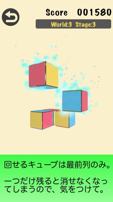 最前列のキューブやステージを回すことができます。縦か横の一列が同じ色ならキューブは消えます。全部のキューブを消せたらクリアです。クリアしたスコアによってランクが金銀銅に分かれます。