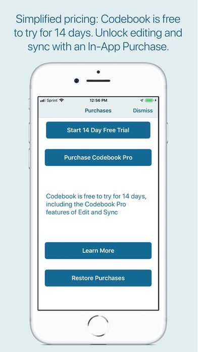 Codebook is free to try for 14 days, after which an In-App Purchase of Codebook Pro is required to access the sync and editing features.