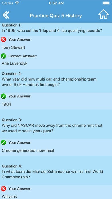 Motorsport Quizにはランダム出題モードが有り、240問の問題を5回の誤答でリタイアとなるシステムとなっています。カテゴリーごとのクイズでは解答に要した時間や成績系統などの結果が読めます