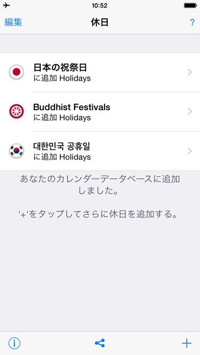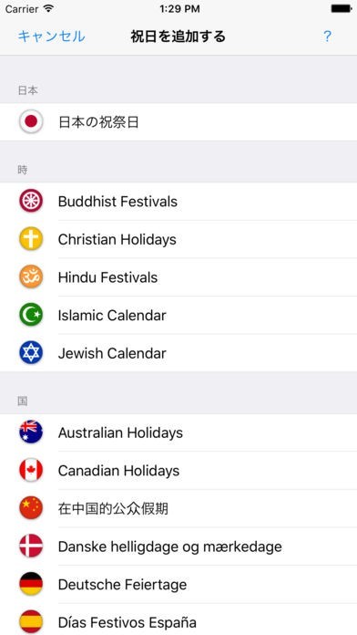 自分の国の祝日だけではなく、このアプリは以下のカレンダーも含みます: