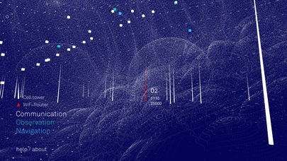 約700万台のセルタワー、1900万台のWi-Fiルーター、数百の衛星情報のプリセットデータを活用してしてあなたの周辺の電波を可視化できます。Wi-Fi電波は赤色、それ以外は白色の細いタワー上の図形をつかって表示されます。