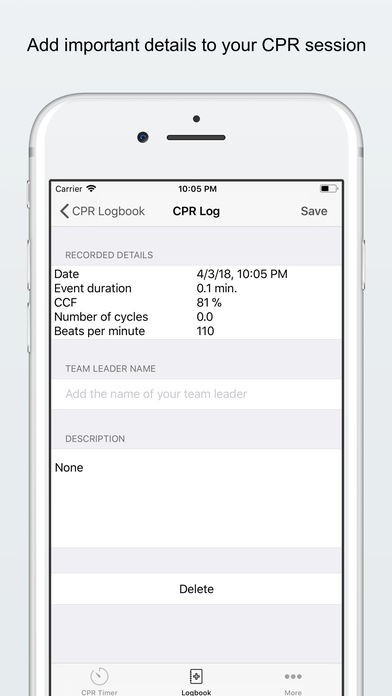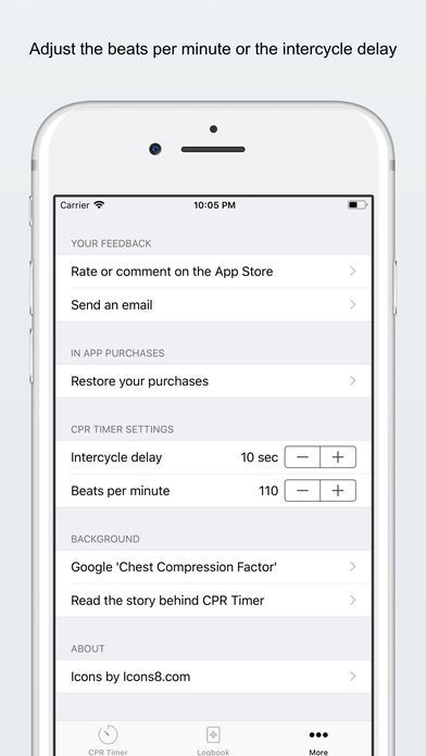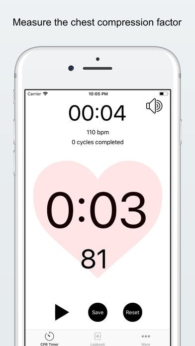 CPR Timerは、救急隊員が心肺蘇生中の圧縮リズムを維持するためにサポートします。除細動器がないときに代わりに使えて便利です。医療機器ではありませんが、緊急時に目安として使え役立ちます。