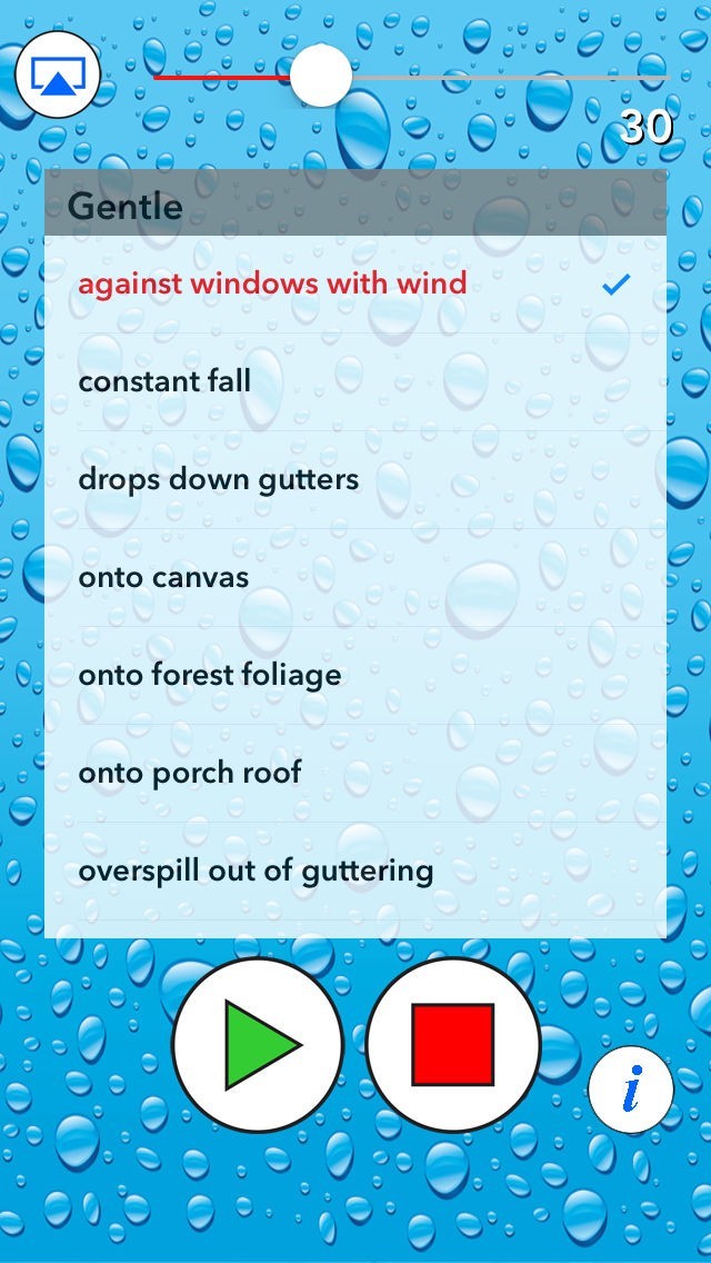 数十種類の雨音の中から、好みの雨音を選択して流すことができます。たとえば、Gentle onto porch roofなどであれば、屋根に当たる雨音を再生することができ、あなたを眠りに誘います。