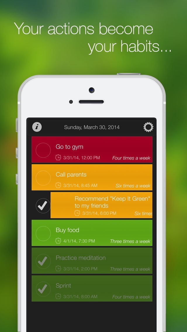 Keep It Green is a program which will help you develop new habits, get read of bad ones, plan any regular activities. Without strict plans, deadlines and rules. Without limits.