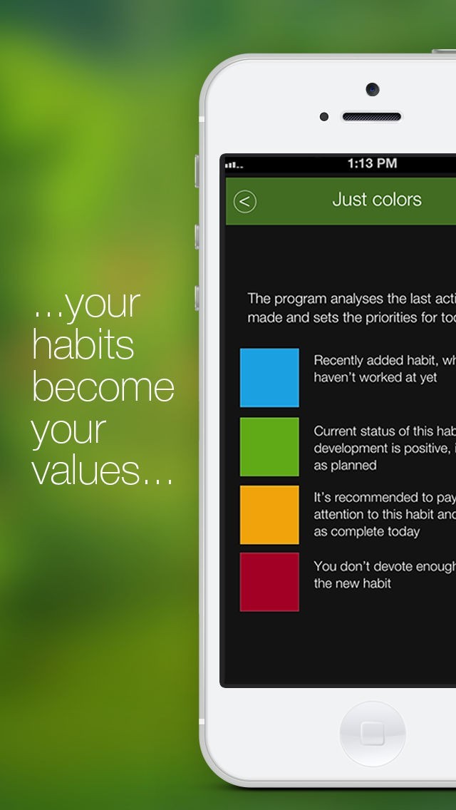 Green color – everything goes well, yellow – you should pay attention to this habit development, red – you ignore this habit, etc.