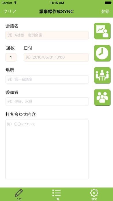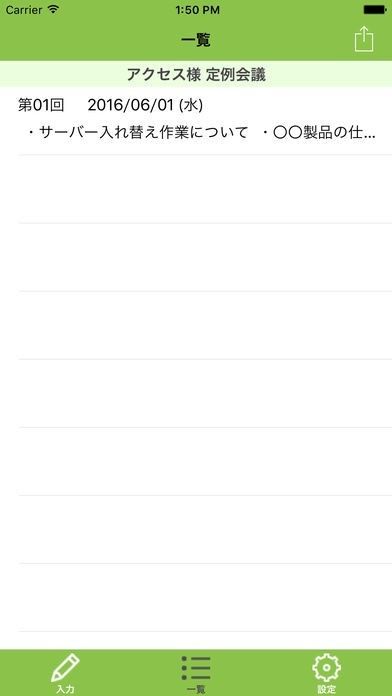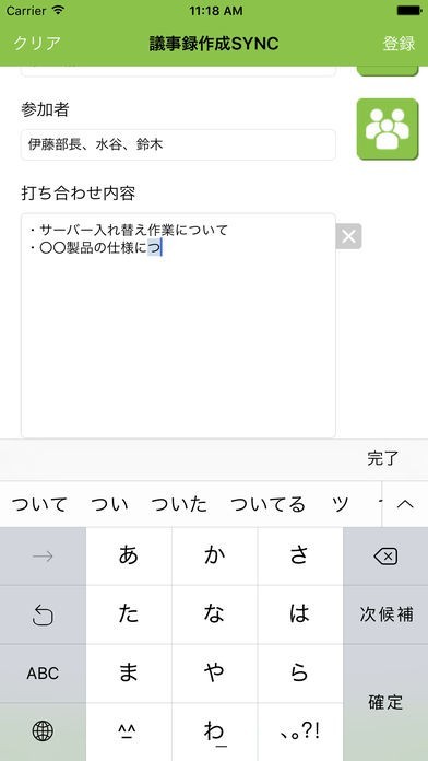 会議のタイトル、日付と場所を入力したら、あとは会議の内容を自由に記入するだけで作業が完了します。つい忘れがちな項目は別に分かれているので書き忘れがなく、スマホなので手軽に作業できます。