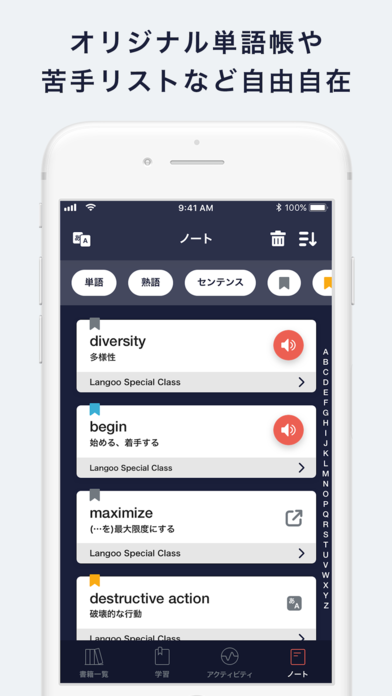 ノート機能はLangooの大きな特徴の一つです。各教材で出題された単語や熟語、センテンスのうち、あとで見返したいものは付箋をつけ、自分のノートに記録しておくことができます。