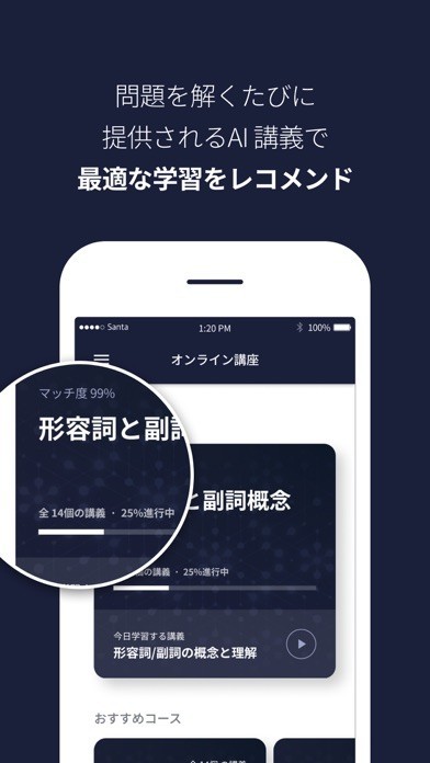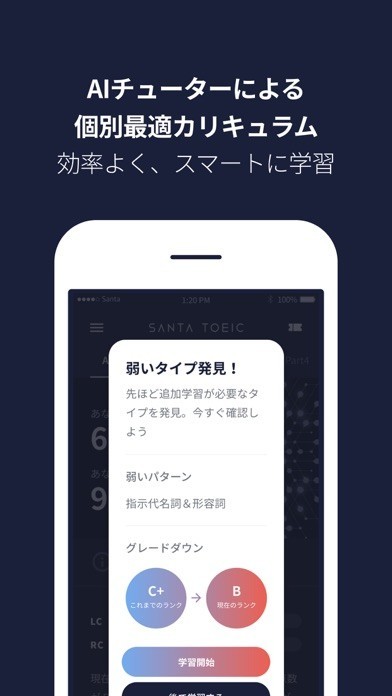 SANTA TOEICは、AIを応用してユーザーのパーソナライズ学習(個別学習)を可能にするアプリです。AIがユーザーの学習進度や理解度に合わせて、一人ひとりに最適なカリキュラムを構築します。ユーザーは自分が解くべき問題だけに集中することができるので、TOEICスコアを最短で上げることが可能です。