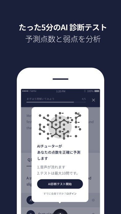 これまでは自分の実力を知るために2時間・200問の模擬試験を受ける必要がありました。しかしSANTA TOEICではスマホから、たった5分・10問ほどの問題を解くだけでTOEICスコアを確認することができます。このAI診断テストは精度が高く、実際のスコアから平均誤差20点以内というデータが出ています。
