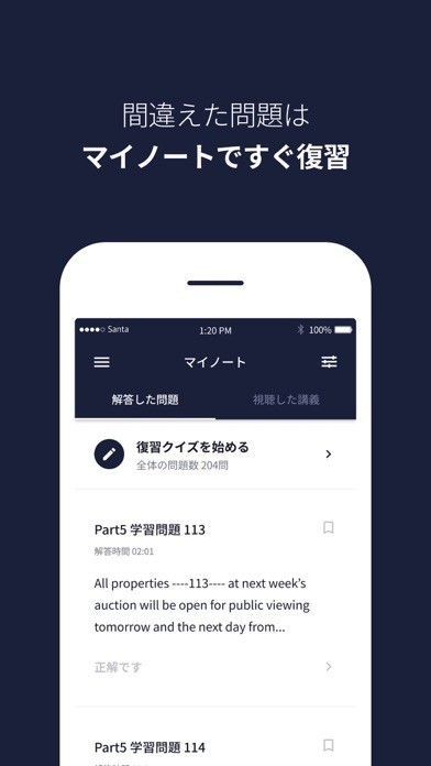 マイノートは学習済みの問題・講義を自動で蓄積する機能です。ユーザーはフィルターを利用して、「自分が間違えた問題」「苦手なPartの問題」に絞って復習することが可能です。