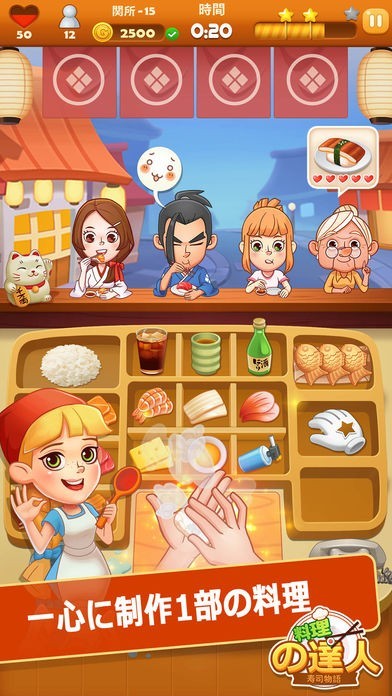 App Storeより引用料理の達人:寿司物語の健康とおいしいレシピを原料を使って笑顔のお客様は、ゲームの中で、あなたが経営数軒の寿司屋で、いろいろな伝統と革新の寿司メニューを、顧客満足のニーズによって!豊富な利益を得る、購入よりあなたの台所道具のアップグレード、多くのステージに挑戦!