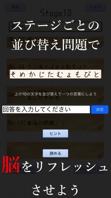 10問ごとにステージが分かれており、合計100問の脳トレ問題が搭載されています。最初はウォーミングアップで簡単な問題から、徐々に難しい問題まで自分の脳力を鍛えることが出来ます。