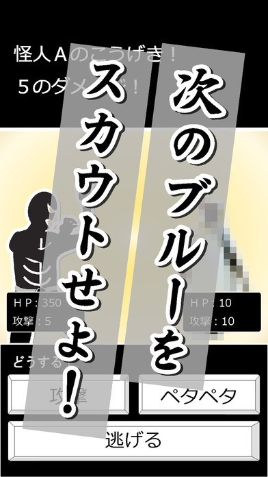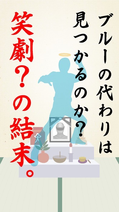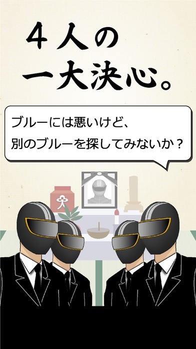 怪人との戦いの中、命を落としたブルーの代わりを探す「今日でブルーの一周忌を迎える訳だが・・・。」 プレイヤーは残された仲間として、新ブルー候補のスカウトへと乗り出しましょう。 特撮戦隊ものの定番といえば5人。ブルーが抜けたことにより半端な4人戦隊となってしまった現状を打破すべく、仲間達が繰り広げるシュールな会話は必見。 敵との戦いはコマンド形式で表現され、「攻撃」や「逃げる」などをタップで選んで進行します。 30人もの候補達の中からいったい誰が新ブルーとなるのか、ストーリーの結末を見届けてみてはいかがでしょうか。