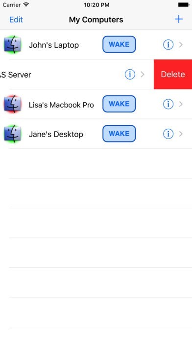 App Storeより引用Wake is a professional networking tool that lets you start up PCs, Macs and Servers remotely. Compatible with all 'Wake On Lan' capable devices, Wake even gives you a status indicator to tell you whether each machine is on or off.