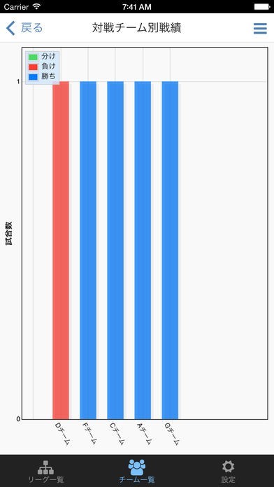 全体のスコア表だけではなく、特定のチーム視点の対戦成績や勝敗表がすぐに表示できます。勝率や結果が対戦チーム別に数値や棒グラフとして分析されているので、得手不得手もわかりやすくなります。