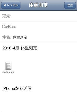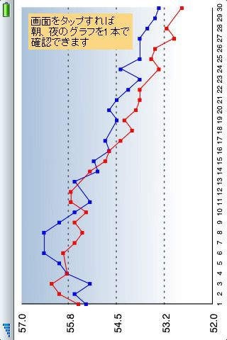 右上のボタンで、入力した体重一覧を見ることができます。一覧参照中に、端末を横に傾ければグラフを見ることができます。