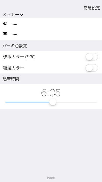 + 左: 設定画面:就寝前メッセージ編集・バー色設定や起床時間設定が行えます。