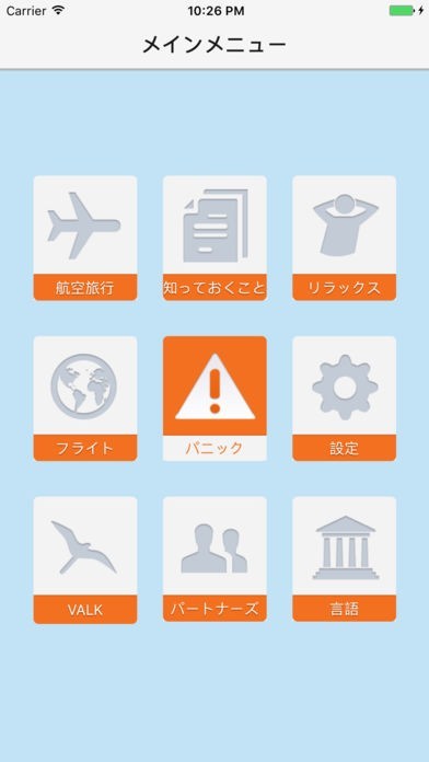 一人で飛行機恐怖症に悩む必要はもうありません。出発に向けて、出発直前に、空港で、また飛行機の中で、いつでもどこでも財団法人VALKのフライトアプリが皆様の手を取りやさしく導いてくれます。フライトアプリは皆様に(事実を離れて皆様が勝手な想像をめぐらさないように)事実そのもをお伝えし、(ストレスを少しでも解消させるために)いろいろなトレーニングをするお手伝いをします。さらにいろいろなアドバイス、パニックに対処するための特別のボタンも用意されています。