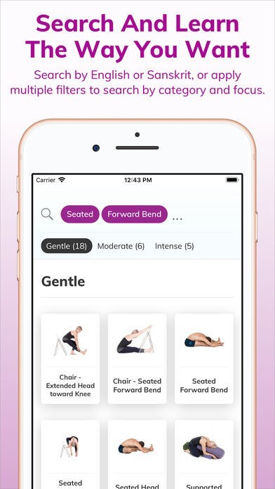 > Search as you want: Search by English or Sanskrit; by health concerns, practice categories or benefits. Add multiple filters to whittle down the results.