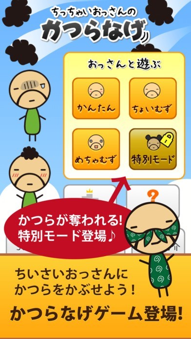 「ちいさいおっさんのかつらなげ」は画面上に現れる小さなおっさんに上手にかつらがかぶれるように、風の向きや強さを考えながらスワイプ操作でコントロールしてかつらを投げてあげる、ちょっと変わったシューティングゲームアプリとなっています。用意されているステージは全部で4つですが、簡単なステージで高得点を獲得しないと次のステージに進むことができないので練習をしてコントロールを磨く必要があります。さらに逆にかつらが奪われる特別モードも用意されています。