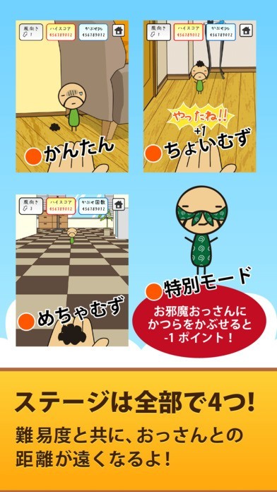「ちいさいおっさんのかつらなげ *かわいいおじさんにカツラをかぶせよう*」は離れたところにいるちいさなおっさんに向かってスワイプ操作でかつらを投げて上手にかぶせてあげるゲームアプリです。吹いている風の強さや向きによってかつらを投げたときの軌道が変わってくるので上手に風を読んでスワイプ操作をする必要があります。かつらをかぶせることでポイントを貯めることが出来るようになっていて、たくさんためると新しいステージを開放することでプレイすることが出来ます。特別モードではかつらをかぶせるとポイントがマイナスされてしまうお邪魔おっさんが登場します。