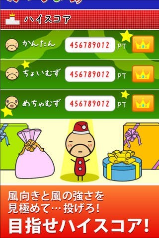 大人気のちいさいおっさんに向かってかつらを投げてかぶせてあげるシリーズのクリスマス特別バージョンが「クリスマスVer.ちいさいおっさんかつらなげ」になります。画面上に登場するちいさいおっさんに向かって風の強さや風向きを考えながらサンタの帽子をスワイプすることでおっさんに帽子をかぶせてあげることが出来るようになっていて、かつらをかぶせることに成功するとかつらポイントを貯めることが出来るようになっていて、たくさんポイントを貯めたら新しいステージを開放することが可能です。難易度がアップするほどおっさんとの距離は離れていくので考えながらスワイプする必要があります。