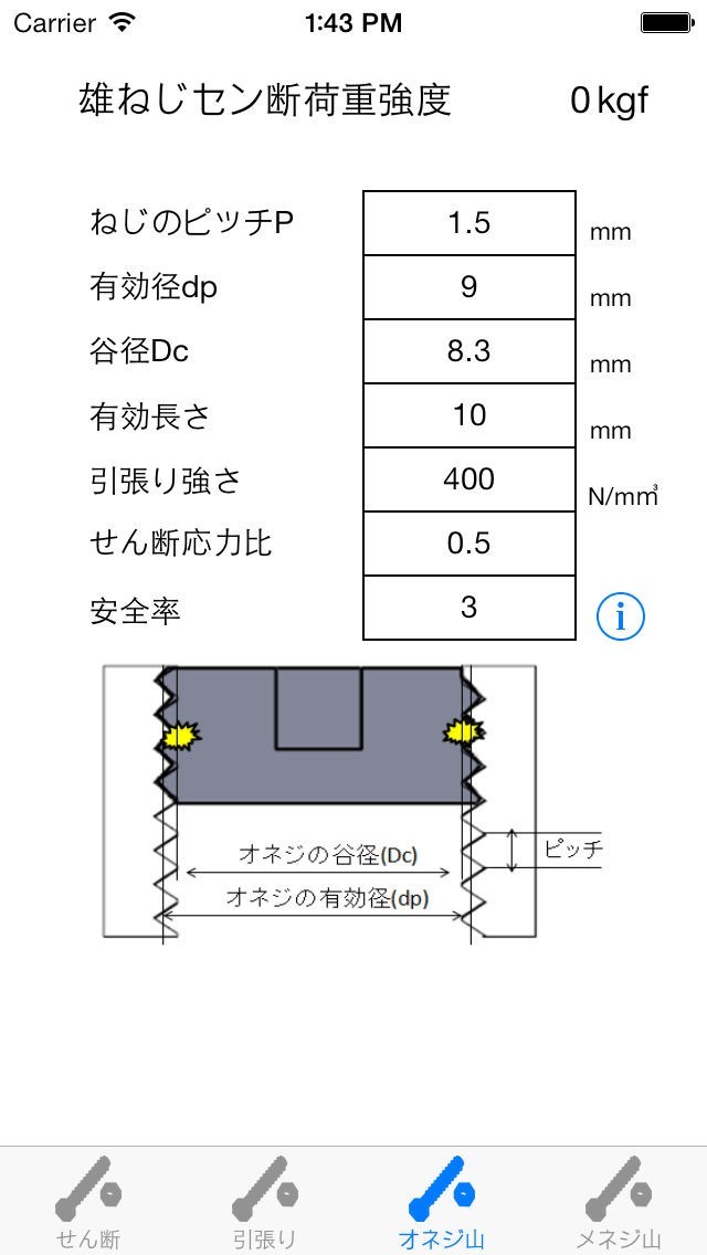 強度計算は剪断荷重、引張り荷重、オネジのねじ山耐荷重、メネジのねじ山耐荷重、の条件で求めることが出来ます