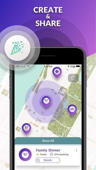「Eveople」は、GPSを利用し、アプリ内で作成したサークルメンバーの現在地が分かるアプリです。子供の現在地の追跡や、友人との待ち合わせ、イベントでの合流がしたい時などに活躍します。